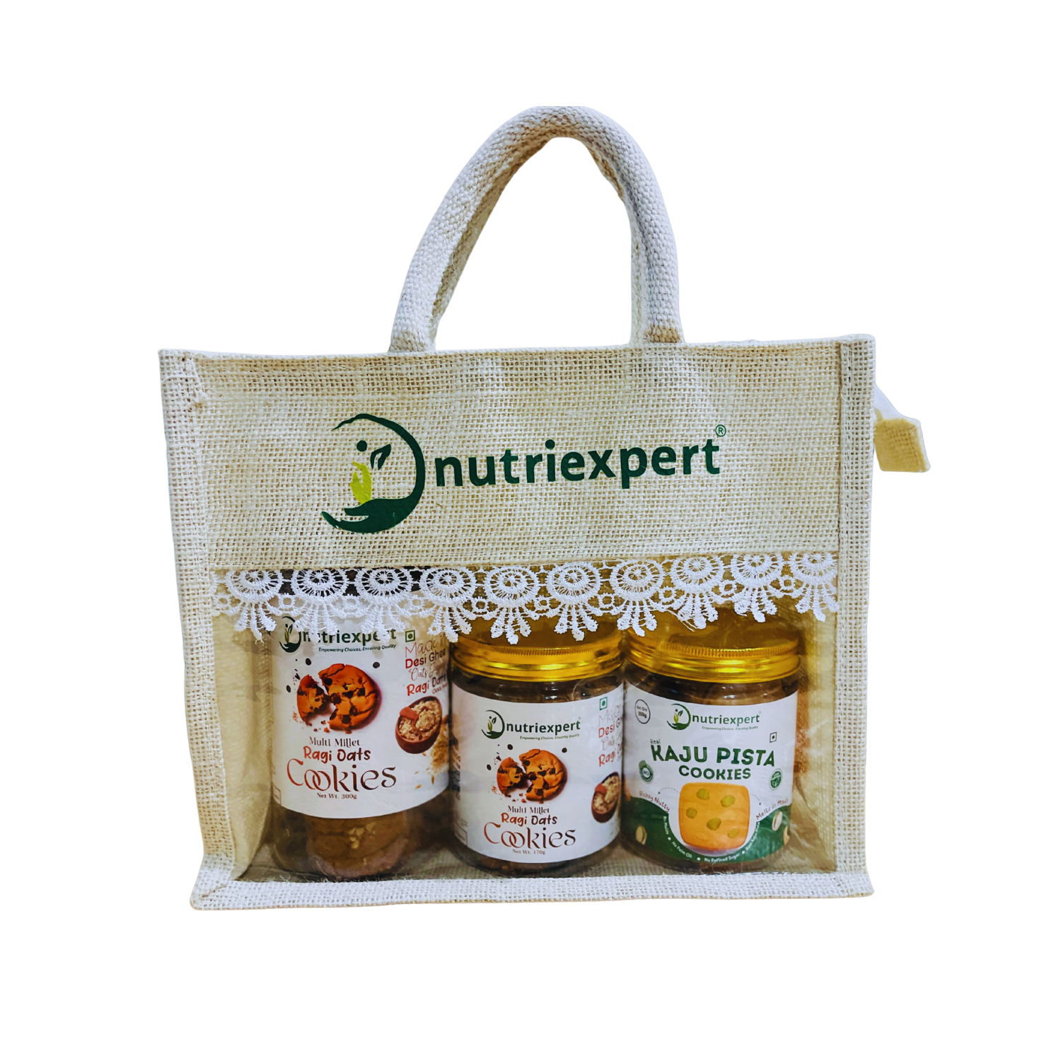 Experience the richness of clean snacking with the NutriExpert Desi Ghee Cookie Gift Pack – featuring two varieties of our bestselling Ragi Oats Cookies and our classic Kaju Pista Cookies. All made using pure Desi Ghee, and packed beautifully in an eco-friendly jute gift bag with lace detailing.